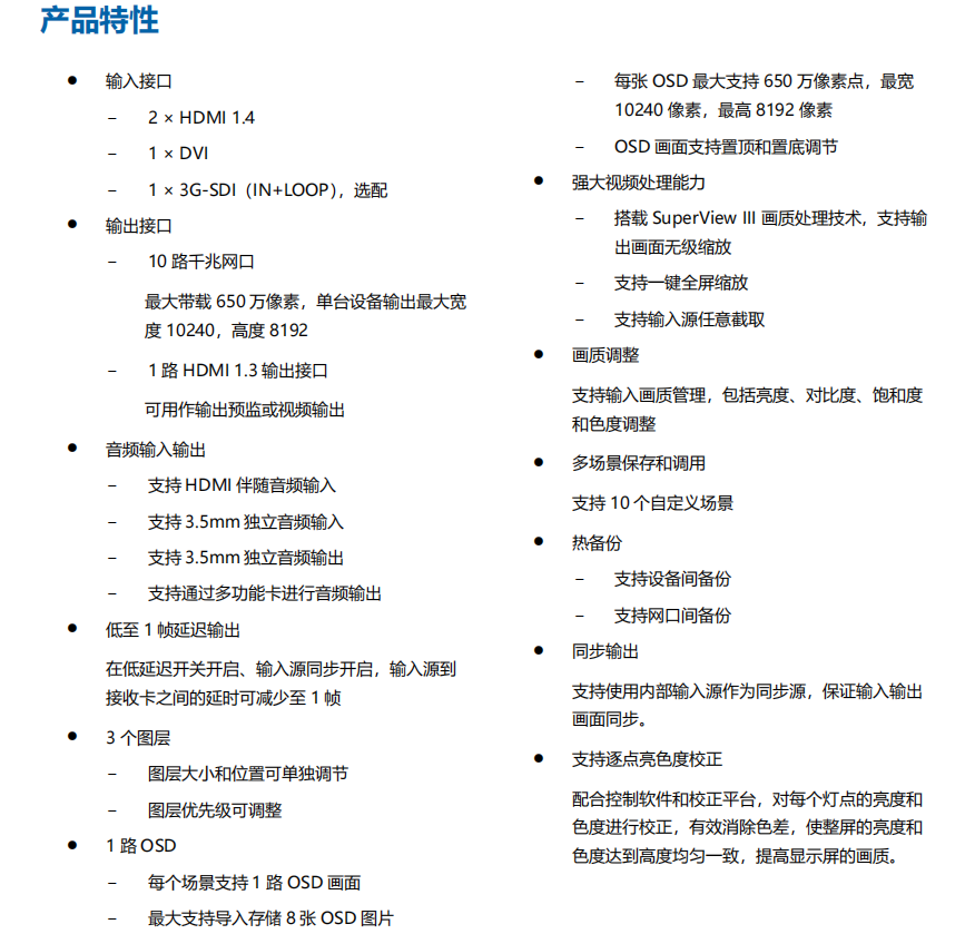 PLS101VN 是一款 10 网口输出的集视频处理、视频控制功能于一体的二合一视频控制器。单设备最大带载 650 万像素点,最大宽度可达 10240 像素,最高 8192 像素,满足现场超宽、超高显示屏控制。 PLS101VN 可接收多种类视频信号,具备高清 4K×1K@60Hz 图像处理能力,支持输出画面缩放、低延迟、逐点亮色度校正等功能,可提供优异的图像显示。 凭借强大的视频处理和发送能力,PLS101VN 被广泛应用于 LED 显示屏固装领域。